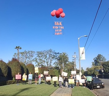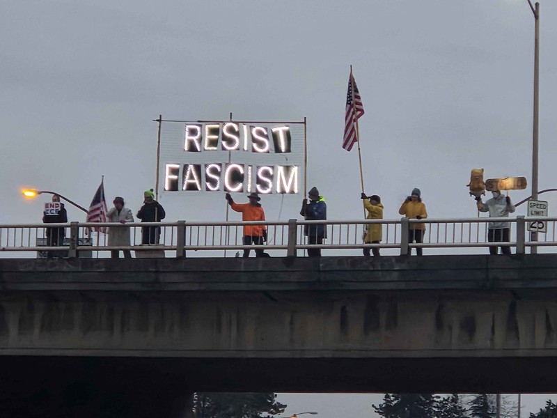 Our giant banners are made of plastic deer fencing with letters cut out of heavy duty orange tarp, making the banner message changeable, and the banner deployment wind-friendly and highly visible. Banners can be deployed on overpasses, as well as on marches, on sidewalks, and other public spaces.